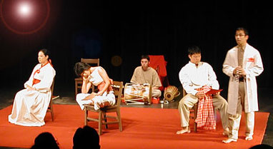 The Lone Tusker is South Indian playwright and director K.N. Panikkar's exploration into the individual in society. The lead character is a kutiyattam actor who leaves society to explore the forest, and ends up building a new "house" with the wild spirits living there. This production involved actor/dancers from a variety of disciplines: hula, Tahitian dance, and bharatnatyam and explored the splitting or connection of voice and body, having separate actors embody either the voice or body of a single character.